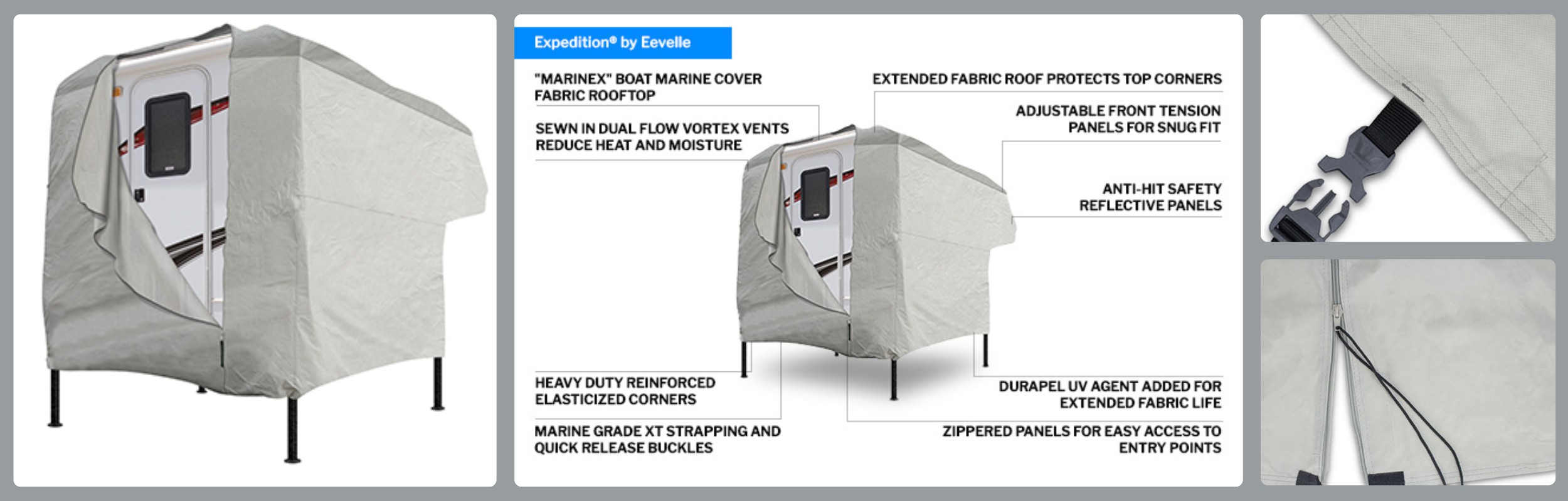 - Zippered panels with anti-scratch sleeves allow easy access to all entry points without removing the cover (*Not available on pop up campers)